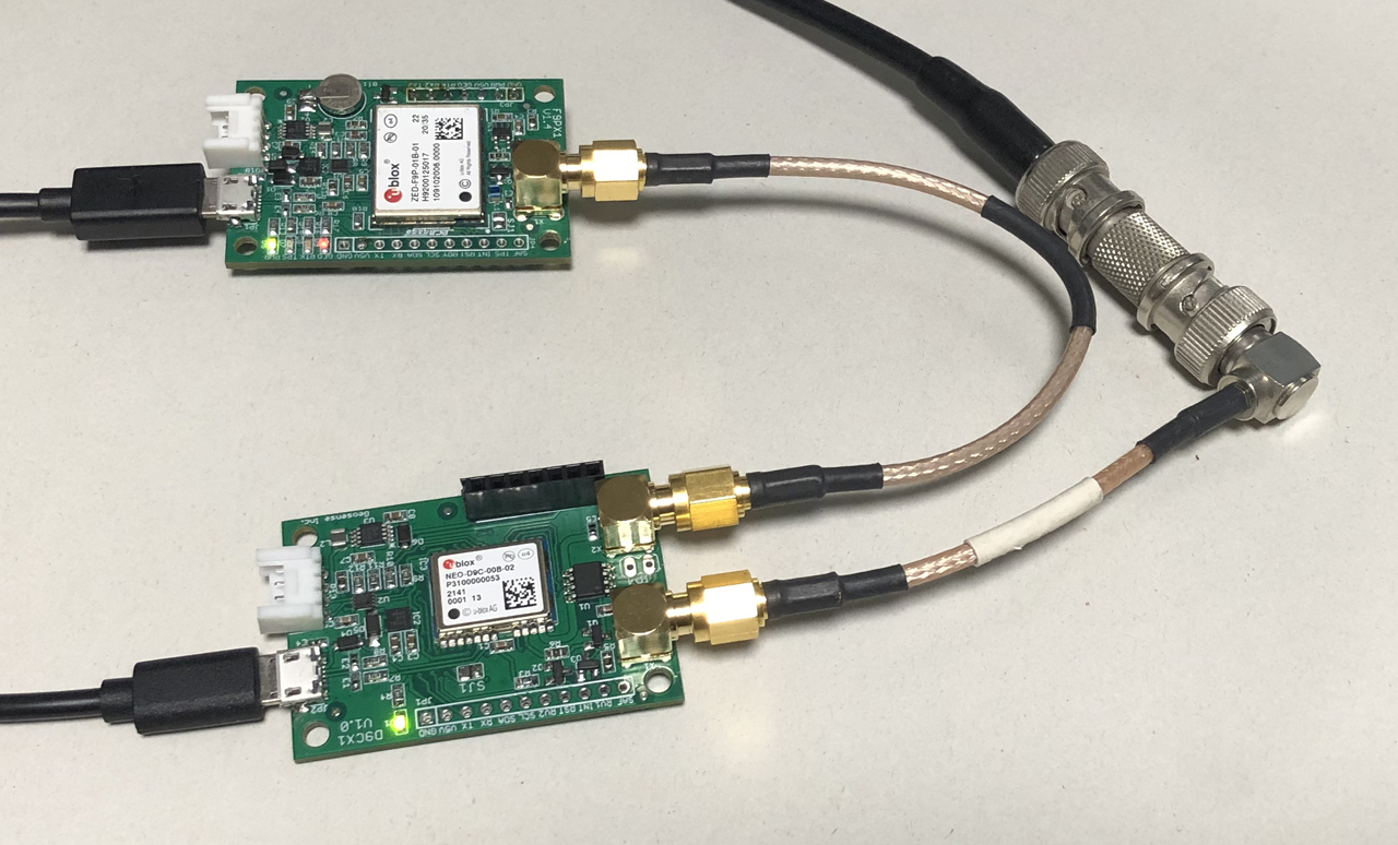 ZED-F9P基板のアンテナ端子は同軸ケーブルでNEO-D9Cのスプリッタ出力コネクタに接続し、アンテナはNEO-D9C基板のアンテナコネクタに接続します。