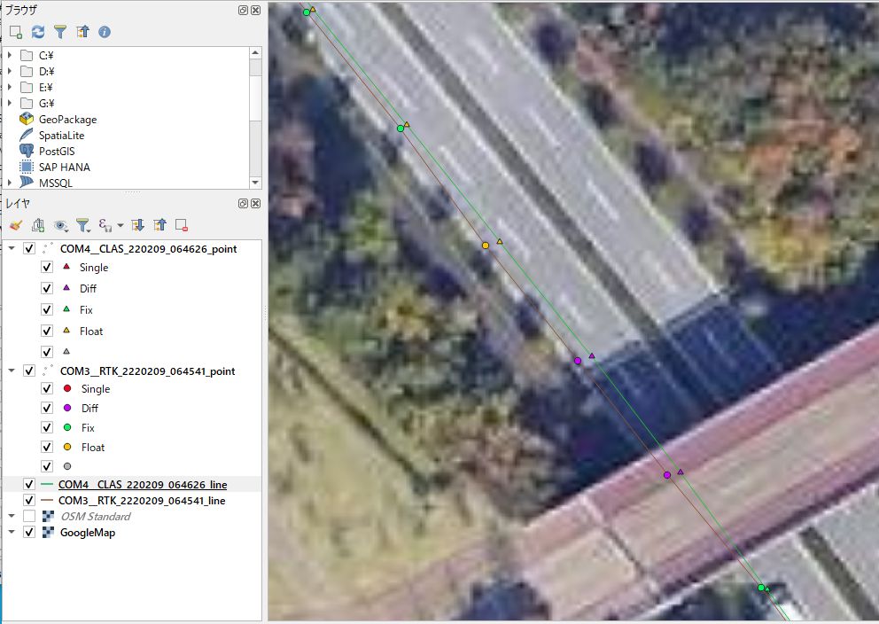 次の画像はRTKとCLASのどちらもFixしている時の拡大画面で、位置が60cmほどずれています。