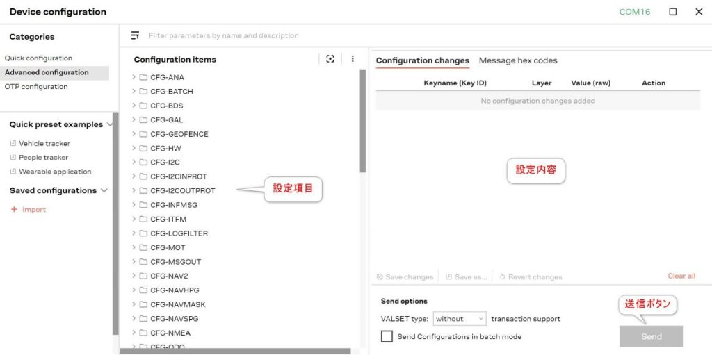 その他、測位レートの設定や基準局としての動作設定など、使用目的に合わせて各種の設定を行う必要があります。