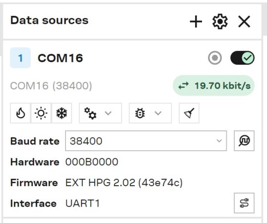 正常にZED-X20Pと接続されると次の画面のように、緑の色で通信速度が表示され、Firmwareの項目にZED-X20Pのファームウェアのバージョンが表示されます。