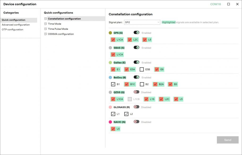 開いた時はQuick configurationのパネルのConstellation configurationが選択されていて、どのGNSSシステムを受信するかの設定画面となっています。