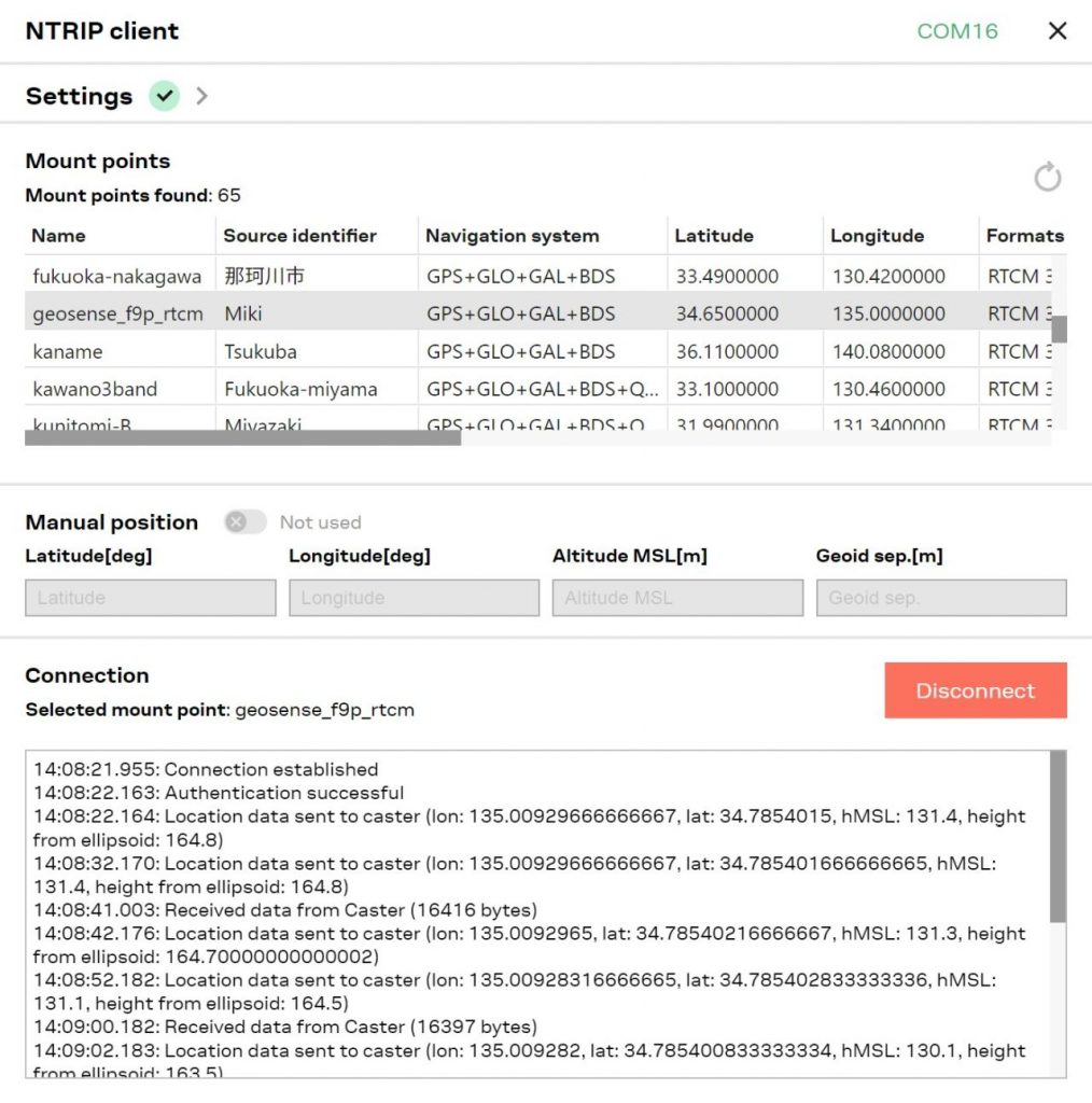 正常に配信されている事を確認後、ZED-X20Pなどの受信機で設定したマウントポイントにアクセスし、RTK測位ができるかご確認ください。
