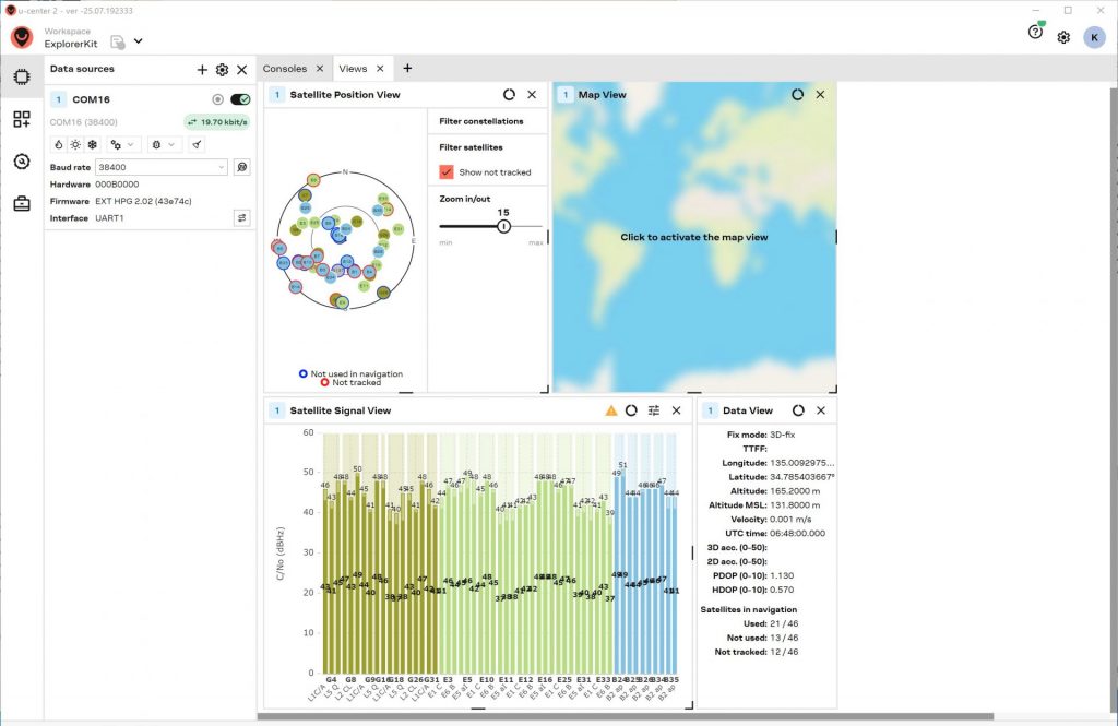 ZED-X20PはL1、L2、L5、L6/E6バンドの電波が受信できますので、正常な場合は、GPSに関してはL1、L2、L5が表示され、Galileoに関してはE1、E5、E6が表示されます。
