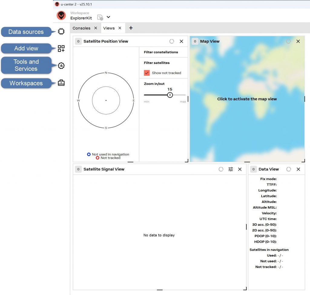 メニューバーの右側にはConsolesタブとViewsタブがあり、ZED-X20Pからのデータをテキストやグラフィックで表示できます。