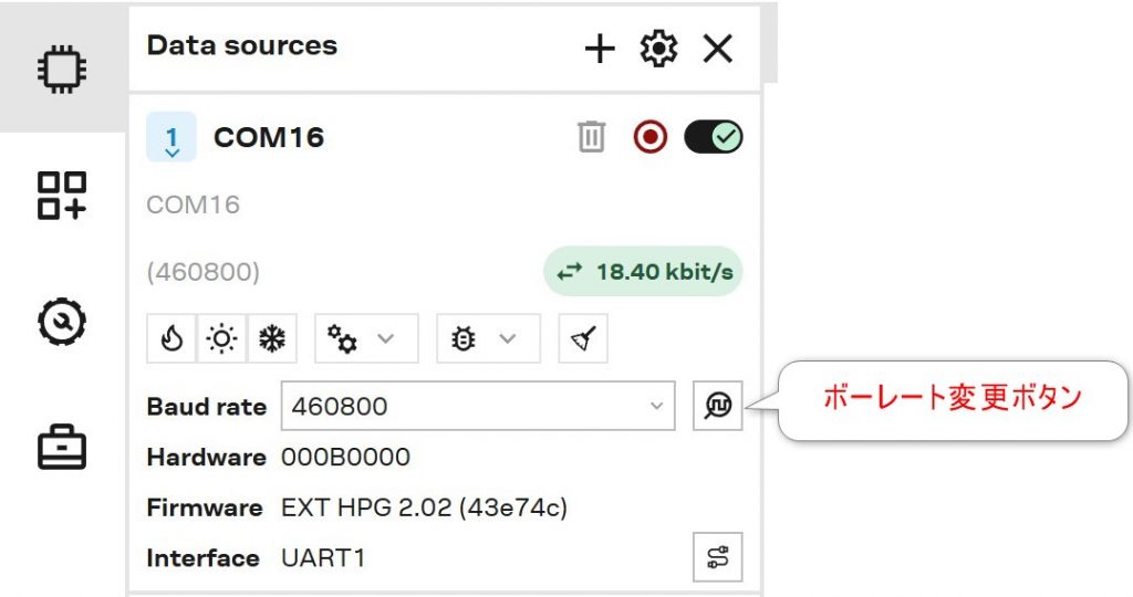 通常は460,800bps程度に設定しておけばいいですが、測位レートを25Hzで使う場合などでは不足する場合もありますので、条件によってより高速に設定します。