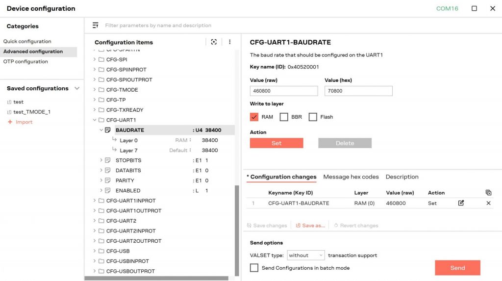 ボーレートの設定はCFG-UART1 という項目をクリックし、表示された属性のBAUDRATEで設定します。