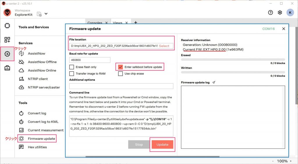更新を行なうにはu-center2のメニューバーのTools and Servicesアイコンをクリックし、次にFirmware Updateをクリックすると、次の更新画面が表示されます。