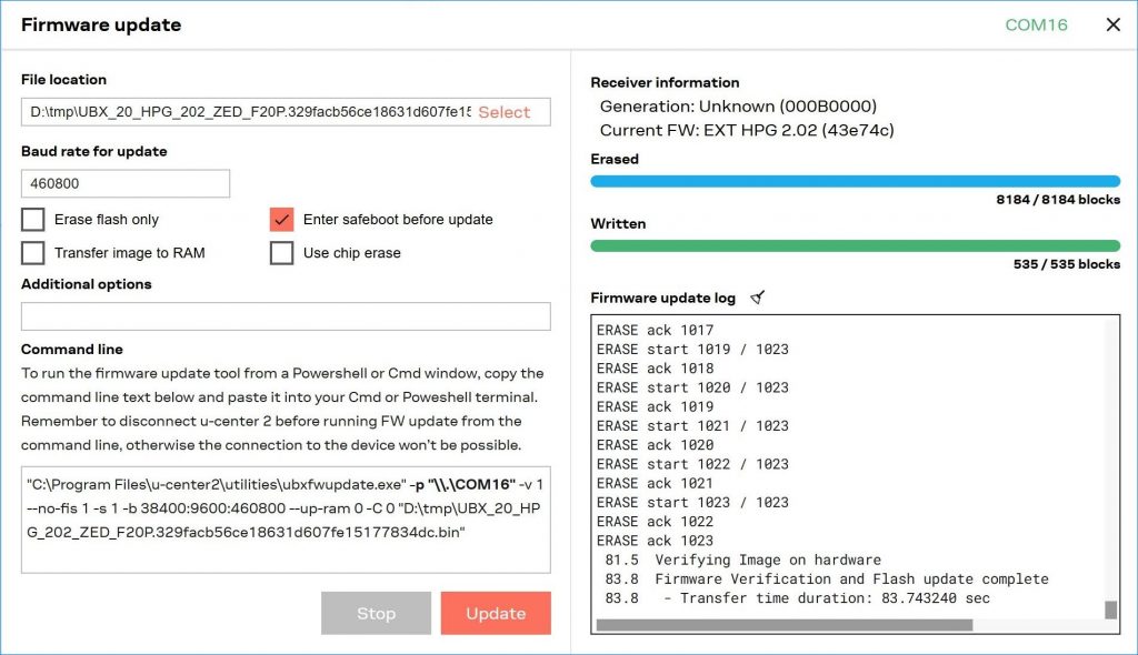 ダウンロード後、u-center2を使ってファームウェアの更新を行ないますが、使用するインターフェースはUART1をお使い下さい。